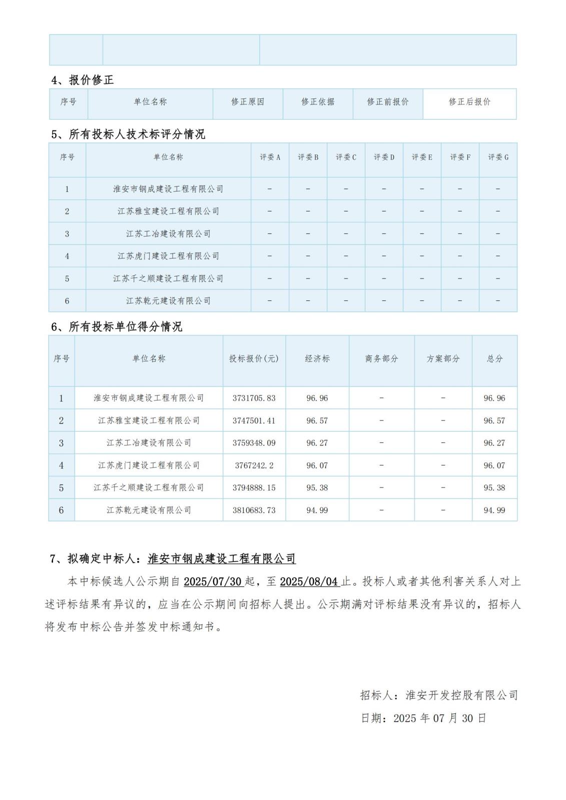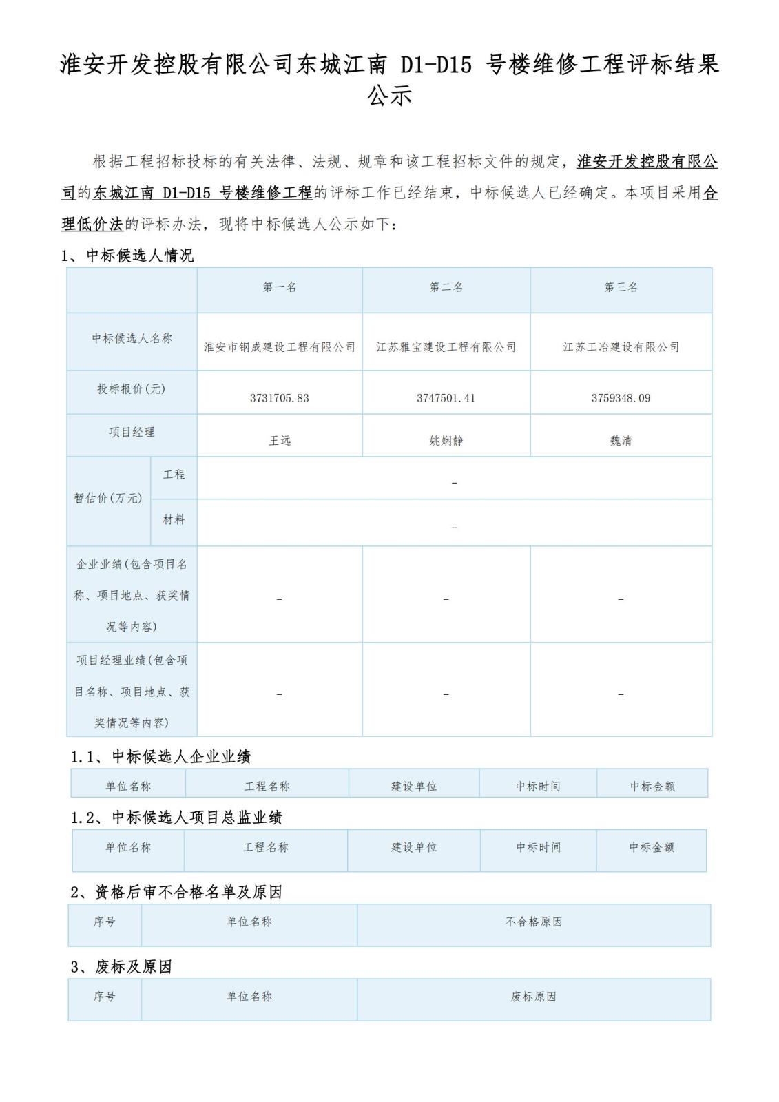 淮安開發(fā)控股有限公司東城江南 D1-D15 號樓維修工程評標結果公示